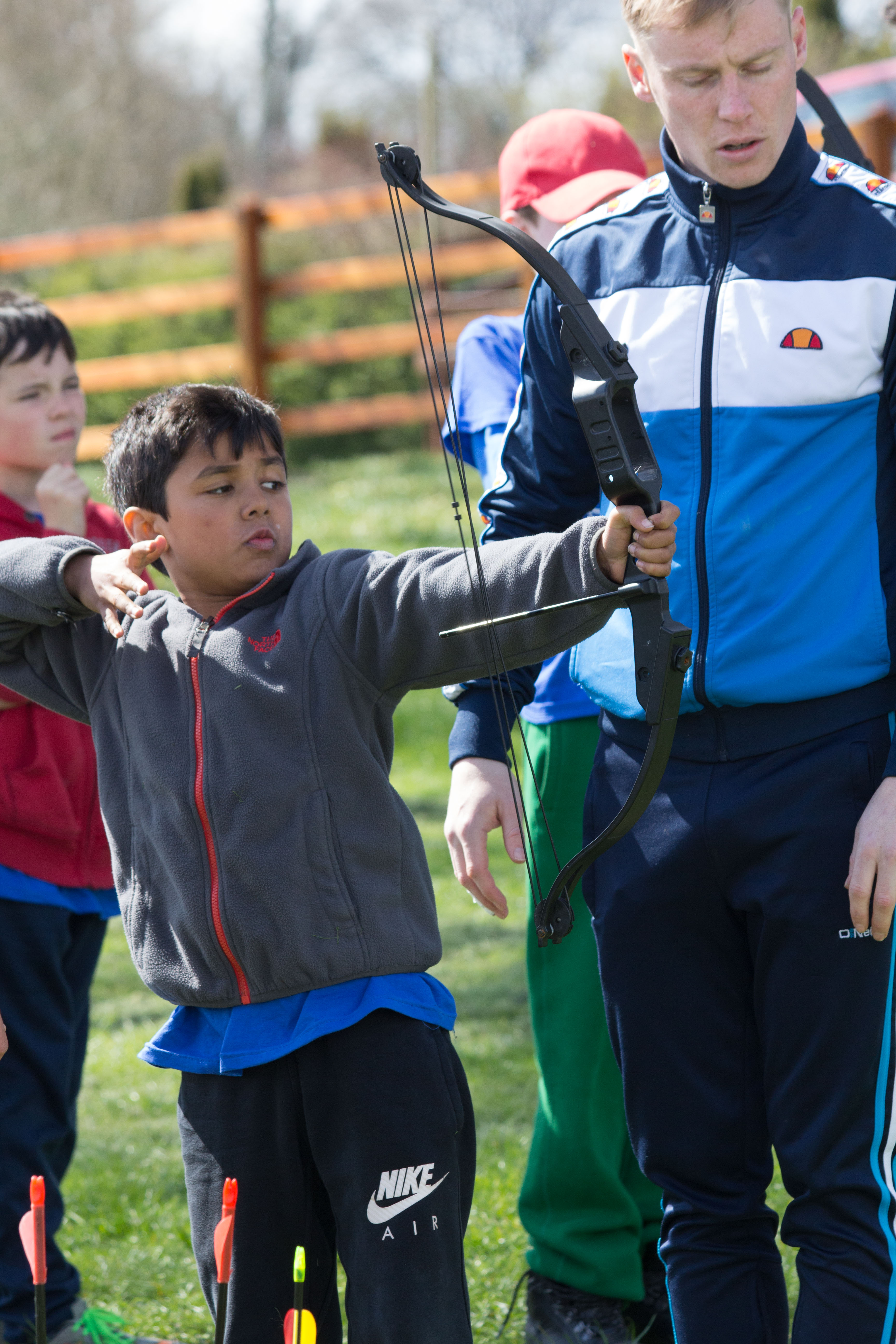 The next morning we all woke up and put on our clothes for the day including our pack holiday t-shirt designed by two of our cubs. We ate breakfast and then while one of our teams tidied up the rest went back to our rooms and packed up everything for the day. Then when our rooms were tidied we had inspection on our rooms and the rule is you are not allowed leave your room until a leader tells you to. We all fall in outside and John explains what is going to happen first – that was orienteering. But before that we took a group photo. We were put into our teams and we were given a map and a little card to put our stamps on. How it worked was you were given a map with different places marked on it and then when you found it there would be a stamper stuck onto a tree or gate. The aim was to get all of your card stamped and be back in the quickest time. When we got back the way it worked was east and west were paired together to go rock climbing and play games while north and south did archery and games then we switched over. When all of the teams had done both things it was time for lunch.